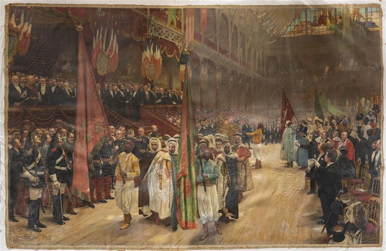 scène (Paris, exposition universelle, foule, magistrat, remise : récompense, drapeau, soldat, vêtement : à l'orientale, élément d'architecture)