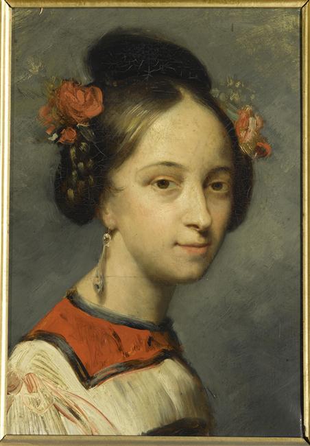 portrait (Taglioni Marie, femme, en buste, de trois-quarts, coiffe : fleur, danseur)