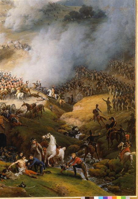 scène historique (bataille, cavalerie, infanterie, blessé, cadavre, habit : armée, Napoléon Ier) ; paysage (montagne, torrent)