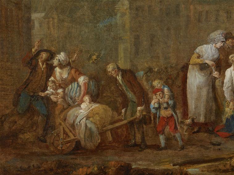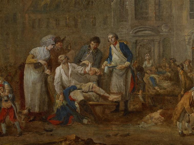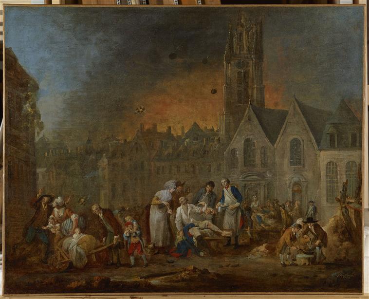 scène (guerre de siège, blessé : soin, peur, repas) ; ville (Lille : place, église)