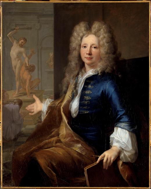 portrait d'inconnu (homme, assis, à mi-corps, de trois-quarts, artiste, objet : art du dessin, perruque) ; scène (artiste, art du dessin, nu, sculpture : Louis XIV)