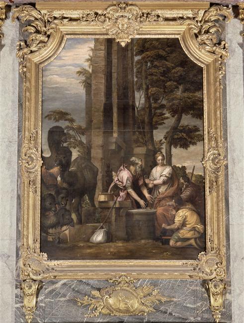 scène biblique (Eliézer, Rébecca, chameau, bijou, Noir, puits, élément d'architecture, colportage, tentation) ; paysage (village)