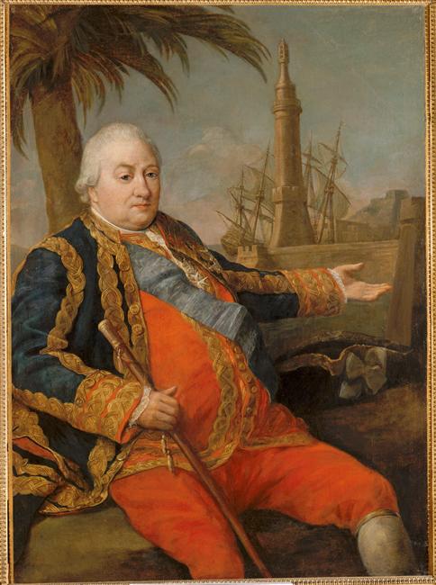 portrait (Suffren de Saint-Tropez Pierre André de, homme, assis, à mi-corps, de trois-quarts, habit, Ordre de Malte) ; paysage (port, phare, bateau à voiles, palmier)
