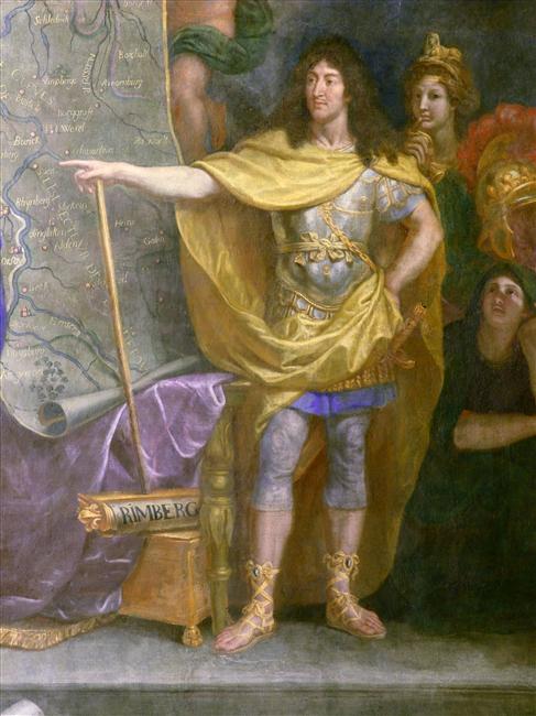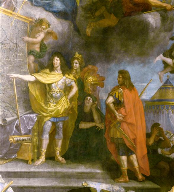 allégorie (Louis XIV, bataille, carte, femme, camp militaire, armure)
