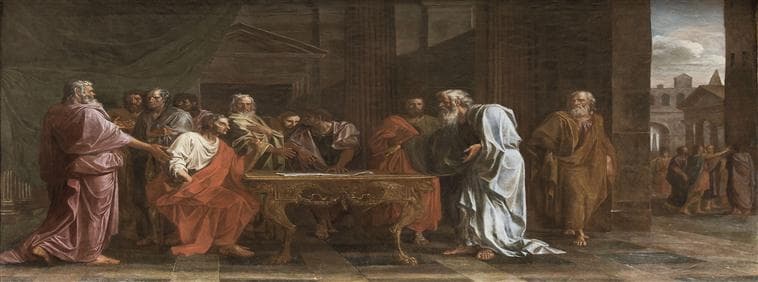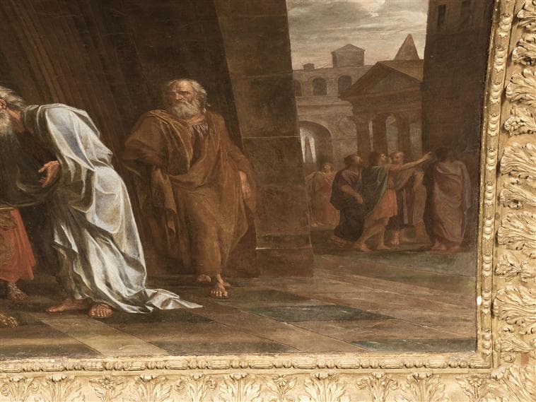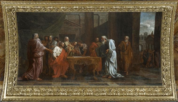 commandé par Louis XIV en 1672 pour le cabinet de Jupiter du grand appartement du roi au château de Versailles ; réplique de Coypel conservée au musée du Louvre (inv 3475)