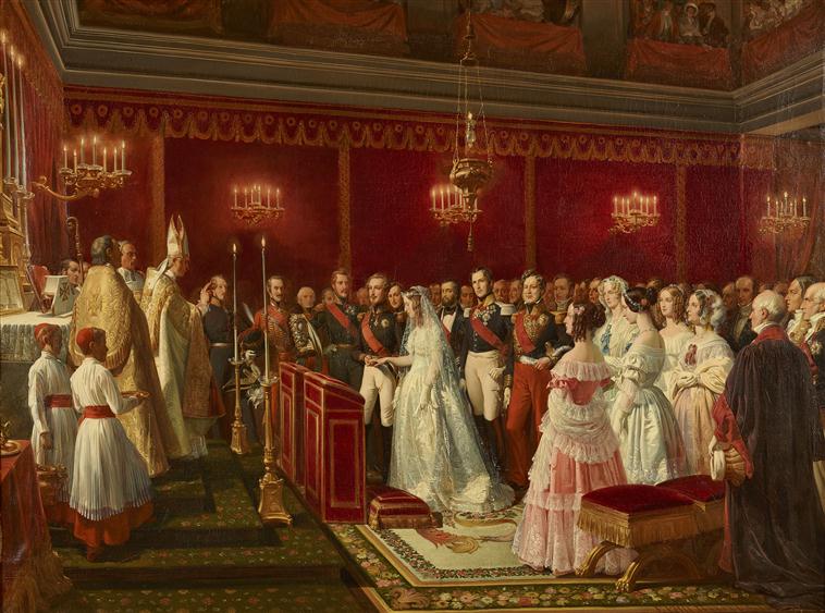 scène historique (mariage, chapelle, château : Saint-Cloud, Nemours duc de, Saxe-Cobourg-Gotha princesse de, évêque, enfant de choeur, autel, bénédiction, robt, habit, famille, Louis-Philippe Ier, Marie-Amélie de Bourbon)