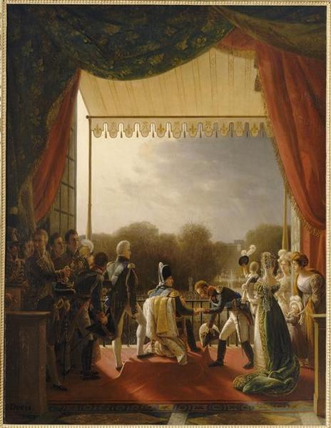 scène historique (Louis XVIII, Artois comte d', Angoulême duc d', femme, enfant, balcon, jardin : Paris, défilé, arc monumental)