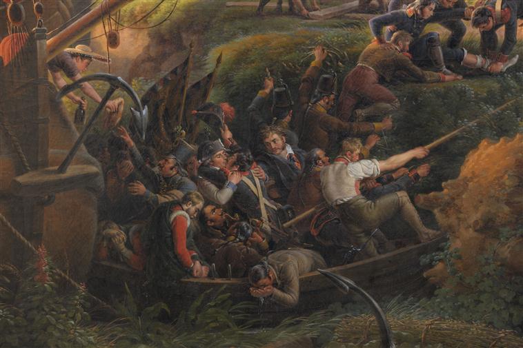 scène historique (Rhin, barque, bateau à voiles, soldat, Kléber Jean-Baptiste, Jourdan Jean-Baptiste comte, drapeau, palissade, embarcadère)