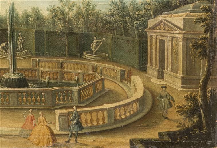 vue d'architecture (décor de jardin, jet d'eau, statue, balustrade, promenade)