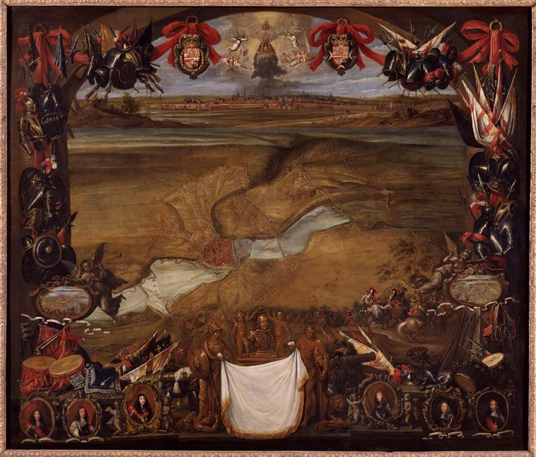 scène historique (ville : Valenciennes, fortification, guerre de siège, Autriche Juan d' : secours) ; allégorie (triomphe, Autriche Juan d' : en buste, putti, drapeau, peinture, armoiries)