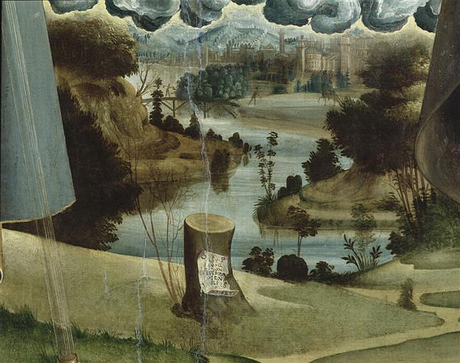 figures bibliques (Vierge à l'Enfant) ; saint Ambroise de Milan (en pied, de trois-quarts, évêque, crosse) ; saint François d'Assise (en pied, de trois-quarts, franciscain) ; portrait (en donateur, homme, de profil, agenouillé, Franciscain) ; nuage ; chérubin ; paysage