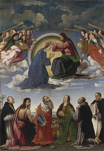 scène biblique (Couronnement de la Vierge, ange, musique) ; groupe de figures (saint Jean-Baptiste, saint Jérôme, sainte Madeleine, saint François d'Assise : franciscain, saint Thomas d'Aquin, saint Pierre)