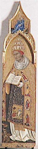 figure (saint Clément Ier, homme, en pied, de trois-quarts, pape, manteau, livre) ; figure biblique (Vierge, Annonciation, partie de)
