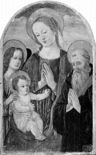 scène biblique (Vierge, prière, Enfant Jésus, ange) ; figure (saint Antoine abbé, ?, homme, à mi-corps, de trois-quarts, prière)