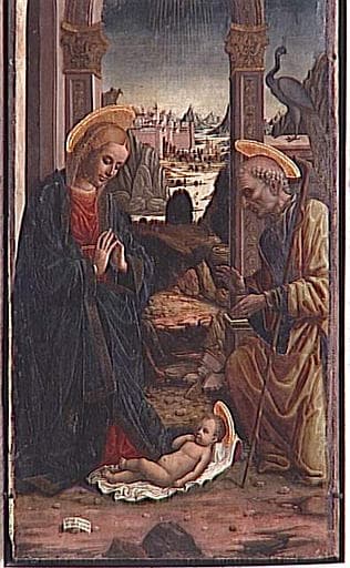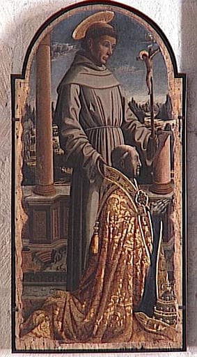 commandé par Giuliano della Rovere pour la chapelle funéraire de la famille Rovere en l'église San Francesco de Savone ; autres éléments : couronnement (calvaire) à la pinacoteca de Savone, prédelle (fuite en Egypte) autrefois dans la collection Benedict à Paris