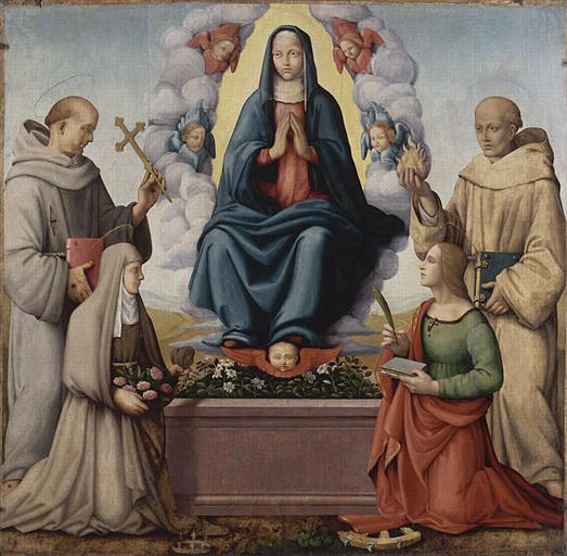 scène biblique (Assomption, séraphin) ; groupe de figures (saint François d'Assise, sainte Elisabeth de Hongrie, saint Antoine de Padoue, sainte Catherine d'Alexandrie)