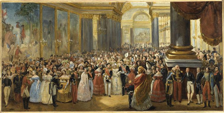 scène historique (inauguration : château : Versailles, noblesse, Louis-Philippe Ier, peinture, lustre, Marie-Amélie de Bourbon) ; vue d'intérieur (musée : galerie)