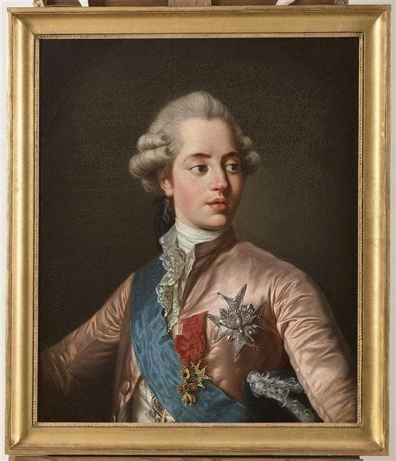 Portant le ruban bleu et la décoration de l'ordre du Saint-Esprit, ainsi que celle de la Toison d'or. Répétition en buste d'un portrait en pied peint vers 1779 disparu