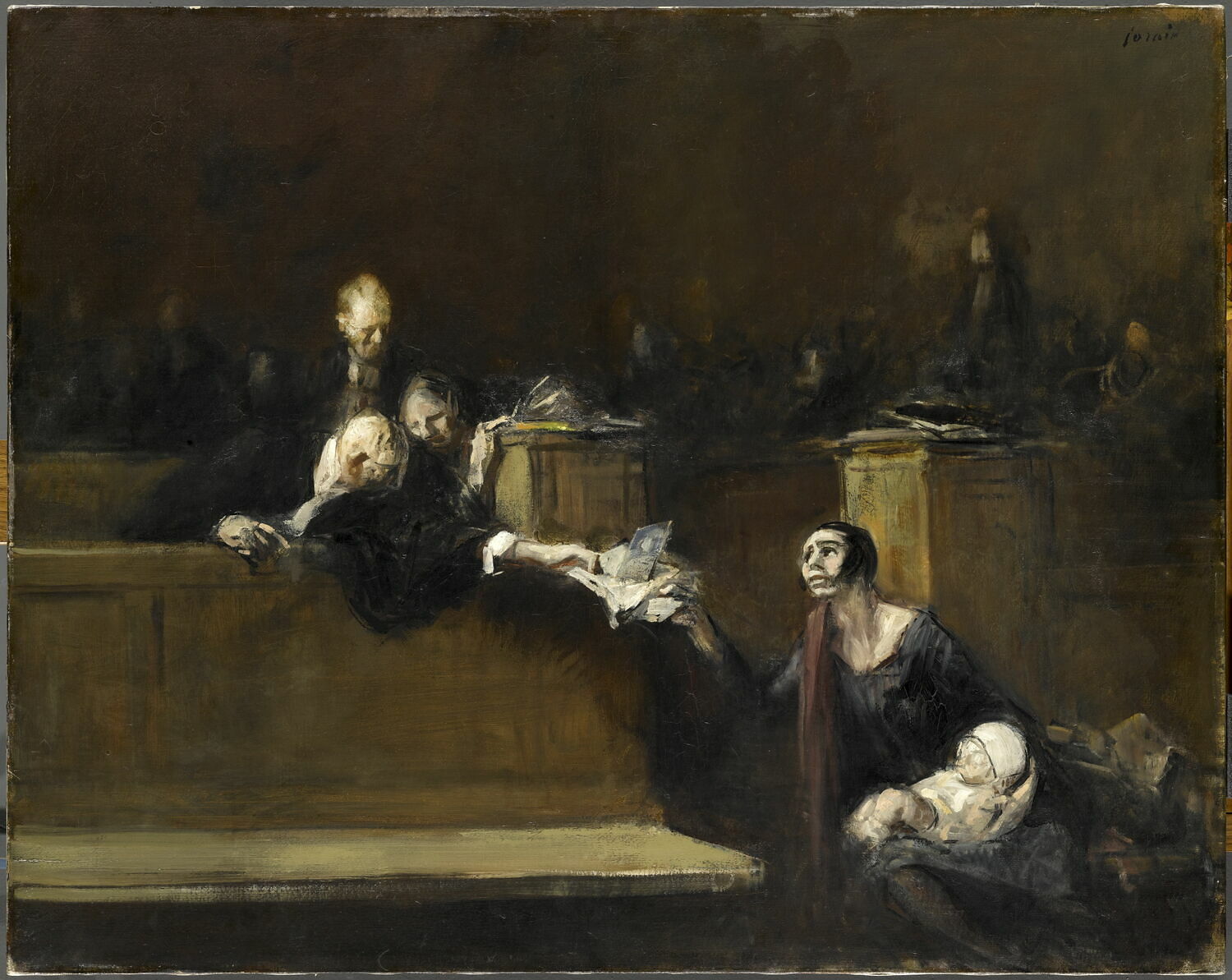 scène (jugement, palais de justice : intérieur, juge, femme, nourrisson)