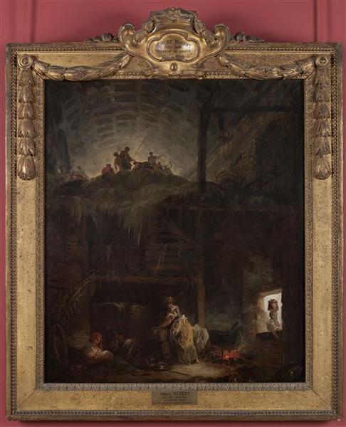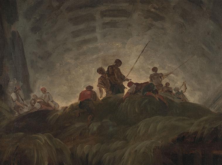 vue d'architecture (palais : intérieur, Rome, de fantaisie) ; scène (préparation des aliments, feu, femme, récipient, engrangement, homme)