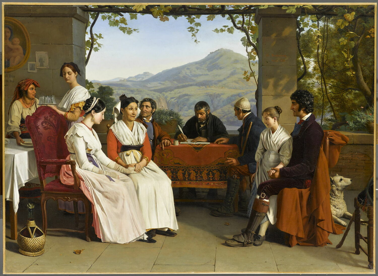 scène (famille, homme, femme, enfant, officier ministériel, ?, écriture, insrument d'écriture : plume, encrier, contrat, mariage, vêtement, tablier, chien, siège, serviteur : femme, bouteille, gobelet, siège, table, vigne) ; fond de paysage (montagne, Italie)