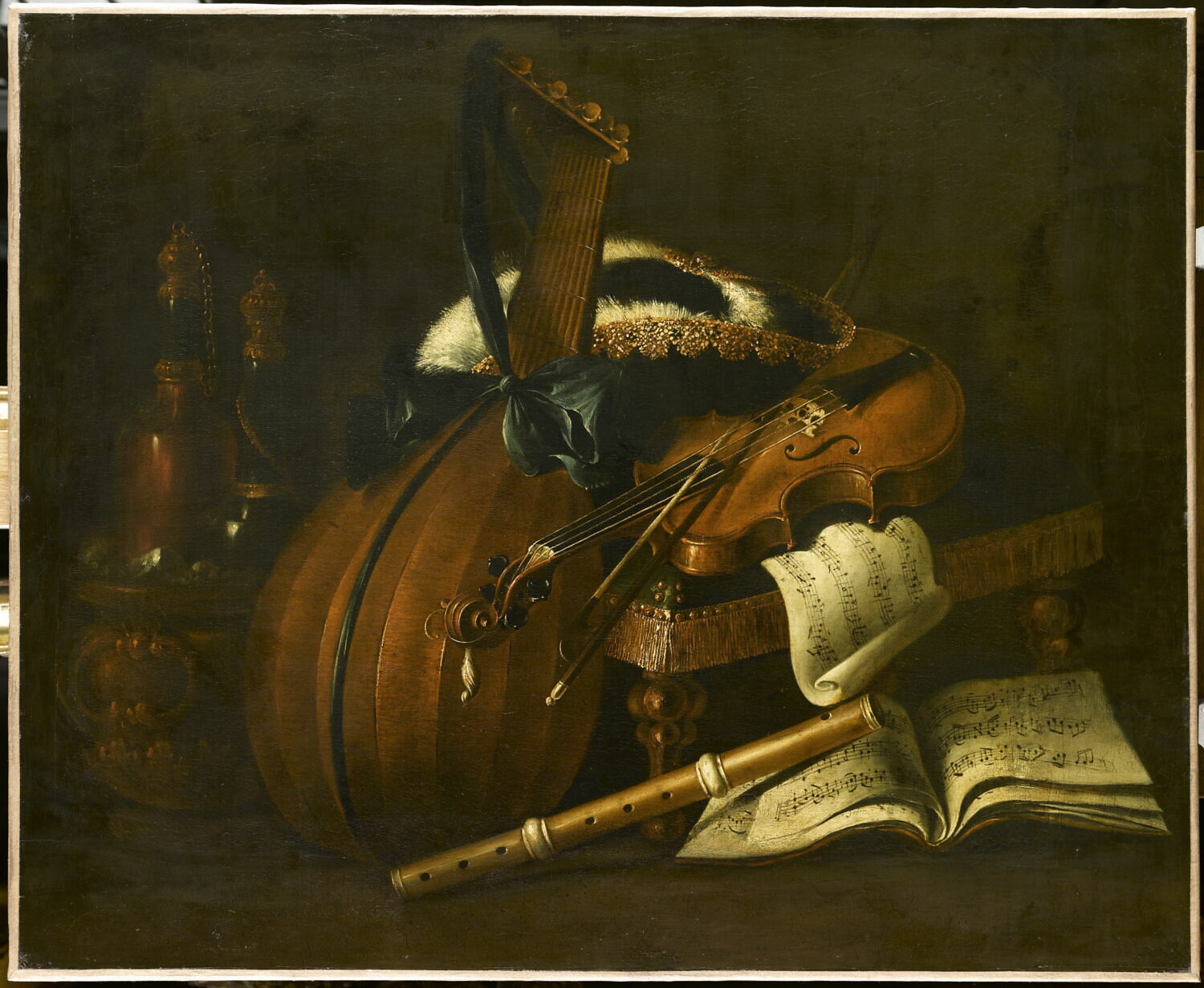 nature morte (instrument à biseau, violon, mandoline, partition, chapeau, bouteille)