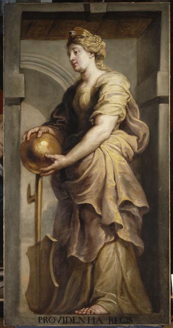 allégorie (femme, en pied, de profil, globe, couronne : oeil)