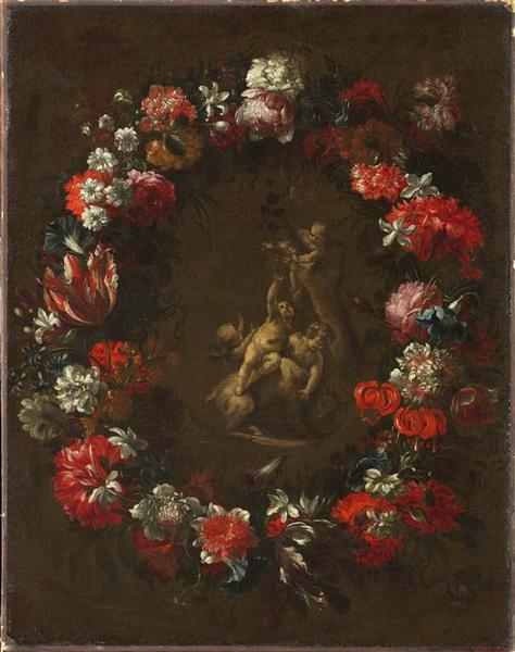 nature morte (couronne : guirlande, tulipe, rose, iris, oeillet, jonquille) ; putti ; chèvre