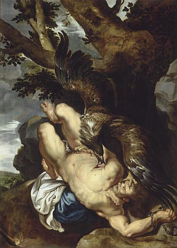 scène mythologique (Prométhée, mort, aigle, rocher, torche) ; arbre