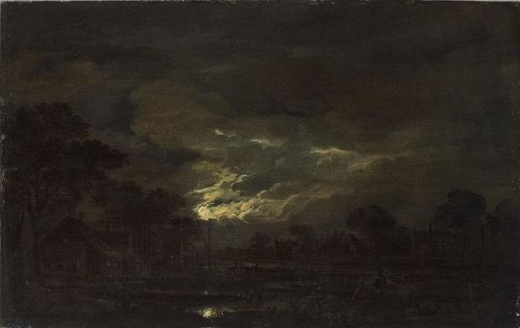 paysage (nuit, nuage, chaumière, marais, barque : pêche à la ligne, arbre)