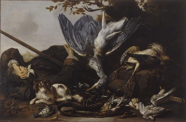 nature morte (héron, perdrix, passereau) ; homme (sommeil, chasse à tir) ; chien ; arbre ; herbe ; maison
