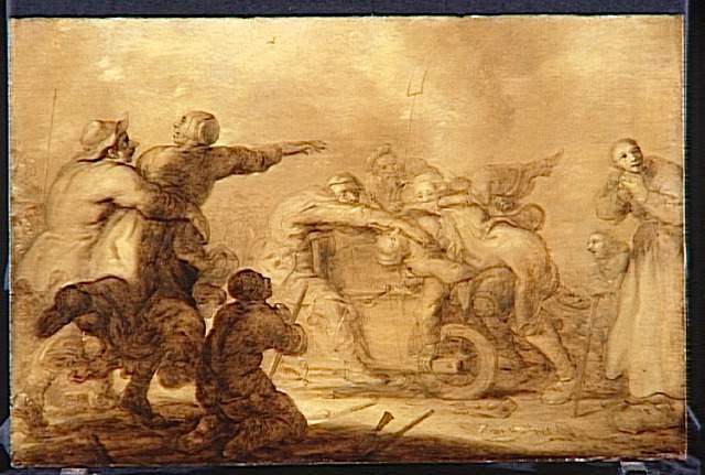 allégorie (gueux : couple, course, instrument de traitement médical : meule, chirurgie, homme, prière) ; bâton (la marche) ; phylactère ; homme (mort)