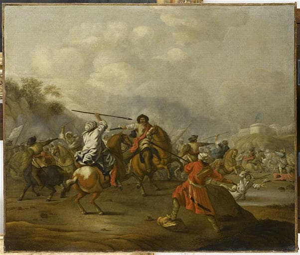 scène (bataille, cavalier, arme, drapeau, mort par le fer) ; rocher ; arbre ; château (fortification)