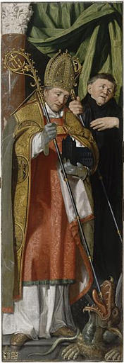 figures (saint Amand de Maestricht, évêque : attribut, abbé) ; dragon (mort) ; effet de tissu