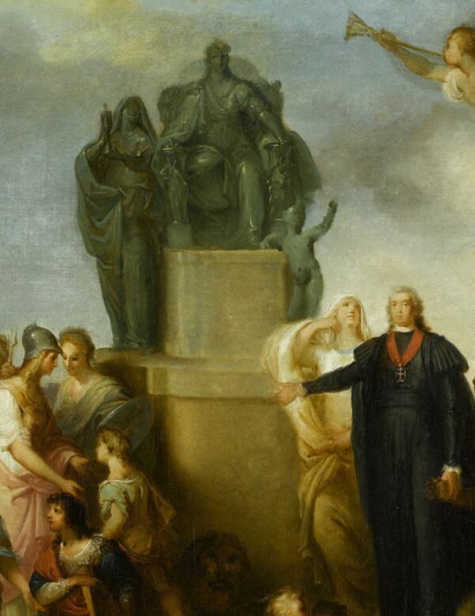 scène (allégorie : fondation, homme, femme, enfant, fonctionnaire, allégorie : renommée, putti, lion, statue) ; portrait collectif (Diaz de Oliveira Manuel, Pina Manique Inaco de) ; autoportrait (Sequeira Domingos de) ; fond de paysage (Belem)