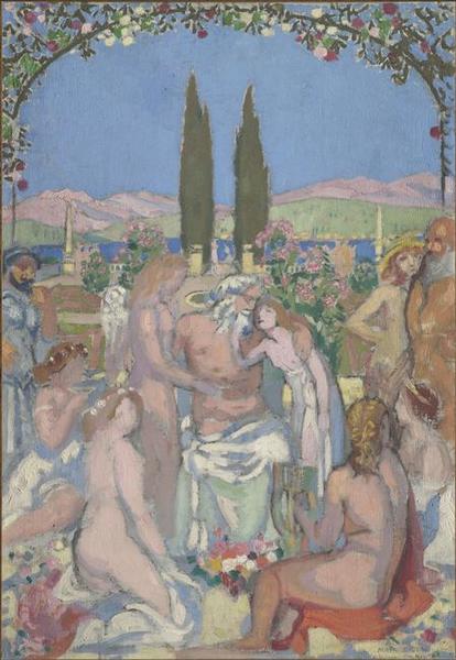 scène mythologique (mariage : fête, Psyché, Jupiter, Apollon, Vénus, Mercure, Mars myth : nu, jardin, cyprès, fleur, colline)