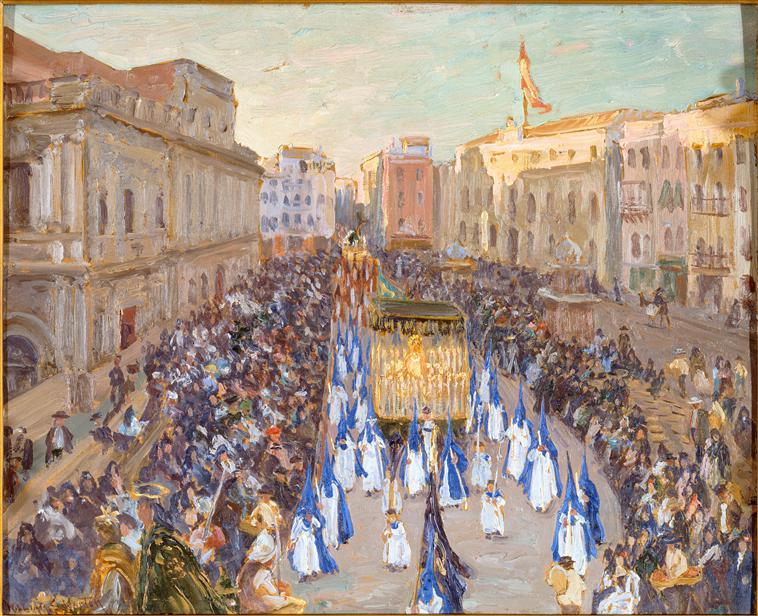 scène (Séville, cadre urbain, procession, religieux, pénitent, foule, maison, effet de soleil)