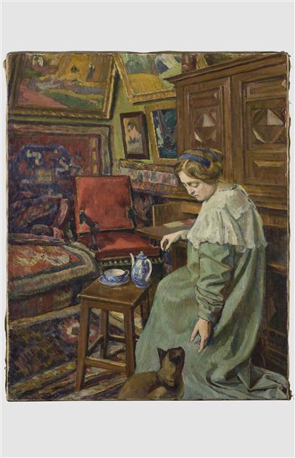 scène (intérieur, atelier d'artiste, peinture, siège, femme, vaisselle, chat)