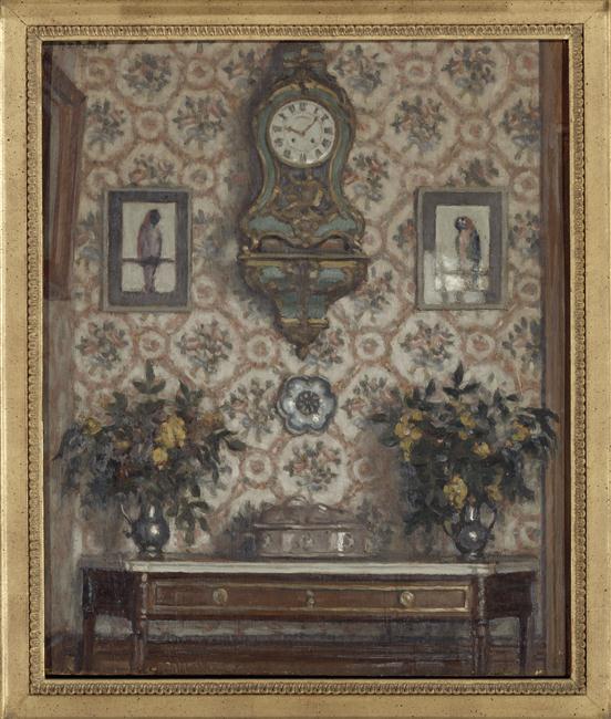 vue d'intérieur (pièce d'habitation, table, pot : étain, bouquet, horloge, Bourbonne-les-Bains)