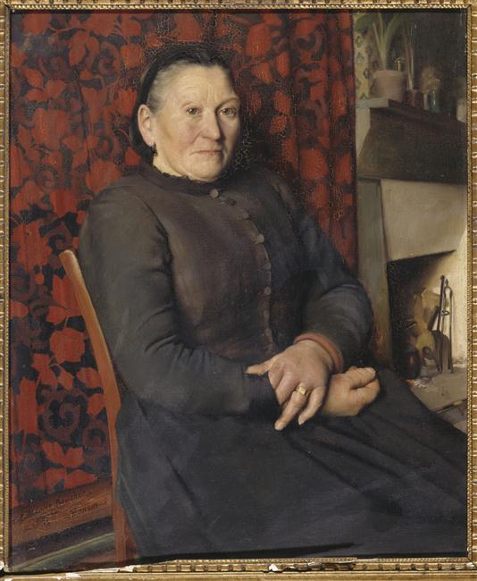 portrait (Boucher Marie, femme, assis, à mi-corps, de trois-quarts, tenture, cheminée)