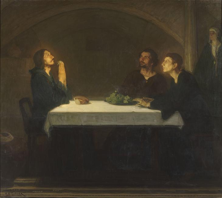 scène biblique (Pèlerins d'Emmaüs, Christ, pain, raisin, table)