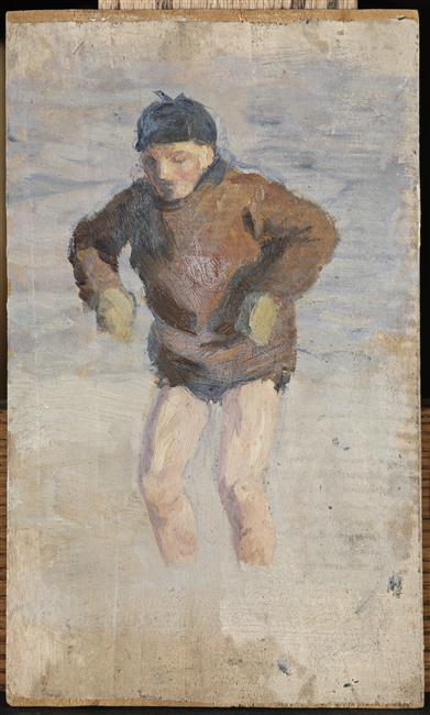 JEUNE GARCON EN VAREUSE, BONNET ET MOUFLES, JAMBES NUES ET PIED DANS L'EAU