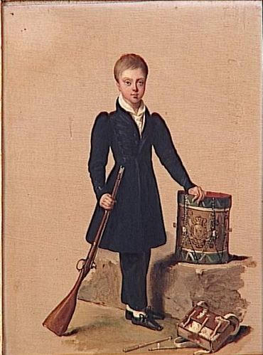 portrait (Penthièvre duc de, garçon, en pied, de face, vêtement, fusil) ; tambour (armoiries) ; sac
