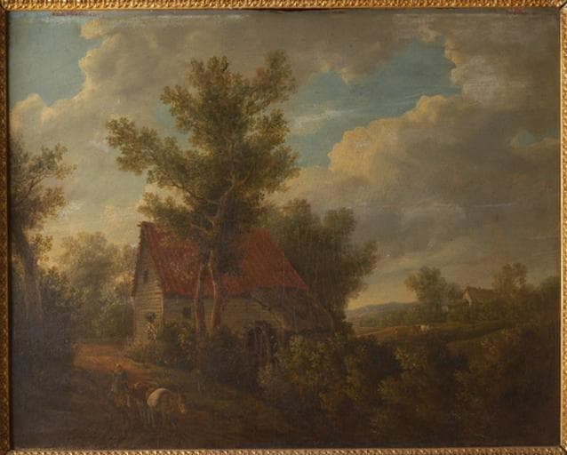 paysage (Neuilly-sur-Seine, moulin à eau, colline, feuillu) ; femme ; âne (portage)