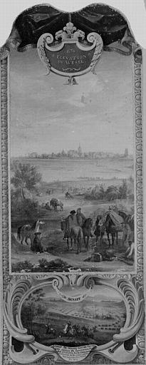 scène historique (guerre de siège, Wesel, cavalier, repos) ; fond de paysage (ville, Rhin) ; scène historique (victoire, Seneffe, cavalier) ; fond de paysage