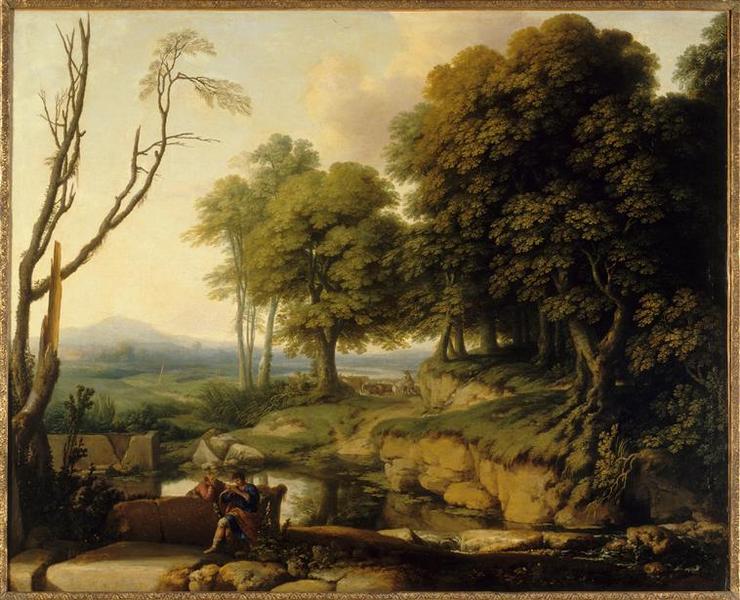 paysage (forêt, feuillu, bois mort, herbe, pré, colline, buisson, cours d'eau, nénuphar) ; berger (garde : animal, flûte à bec)