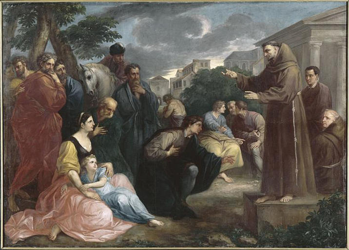 scène (saint Antoine de Padoue, foule, prédication, religieux) ; temple (à l'antique) ; maison ; feuillu
