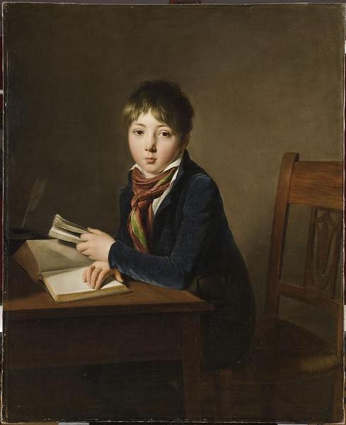 portrait (garçon, assis, foulard (rayure) ; livre ; instrument d'écriture ; plume ; encrier ; siège)