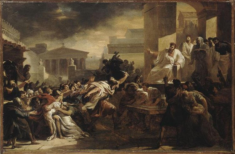 Scène historique (Appius Claudius, poignard, meurtre, Verginia, cadavre, famille, esclavage, Appius Claudius, Marcus Claudius, jugement, temple, antiquité, Rome)