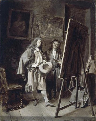 scène (intérieur : atelier d'artiste, peintre, peinture, dessin, art de la peinture, chevalet, tableau, palette, visite, amateur d'art, mobilier)